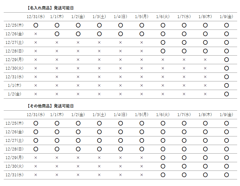 休業に伴い、商品のご指定可能な最短お届け日が異なりますので下記をご確認ください。
